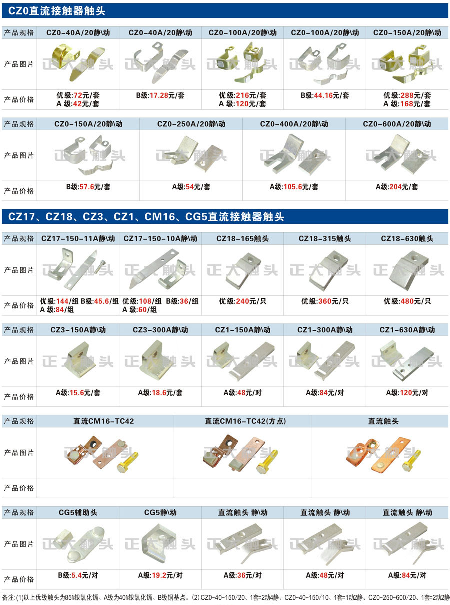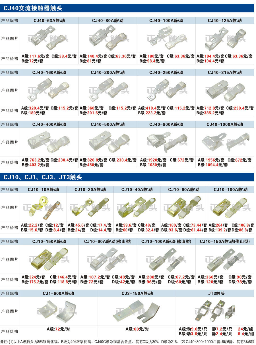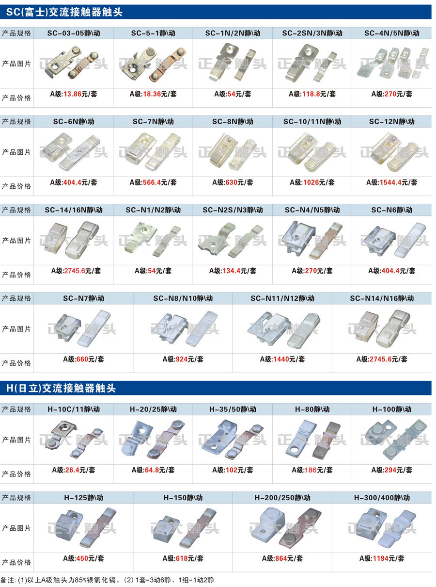 触头元件作为电器开关核心元件,主要用于接触器,继电器,断路器,凸轮控制器,补偿器,行程开关,脚踏开关,辅助开关等。正火电气现生产CJT1,CJX1,CJX2,CJX4,CJX5,CJX8(B系列)CJ20,CJ40,CJ12,CJ15,CJ24,CJ24Y,CJ0,CDC10,CJ91,CT91,CJ913,CJ914,CJ3,CJ8Z交流接触器触头,CZ0,CZ1,CZ3,CZ17,CZ18,CG5直流接触器触头,QJ3,QC83补偿器触头,凸轮控制器,主令触头,KT10,KT12,KT14,KTJ1,KTJ5,KTJ6,KTJ15(QT5),LK1,LK17,LK18,THQ1,TQKT等;断路器触头DW10,DW16,DW15,DW17,DW45,DZ10,DZ20,内燃机触头,矿用触头,叉车,吊车触头,JYN1,JYN2,ZN28,SN10,VS1,梅花触头等。进口ABB系列AF,EH,EK,富士SC系列,日立H系列,施耐德LC1系列,西门子3TF,3TB系列,LG公司(LS产电)GMC系列,三菱机电SN系列。与国内正泰,德力西,天正,人民等,国外ABB,施耐德,西门子,富士,三菱等厂家电气配套。