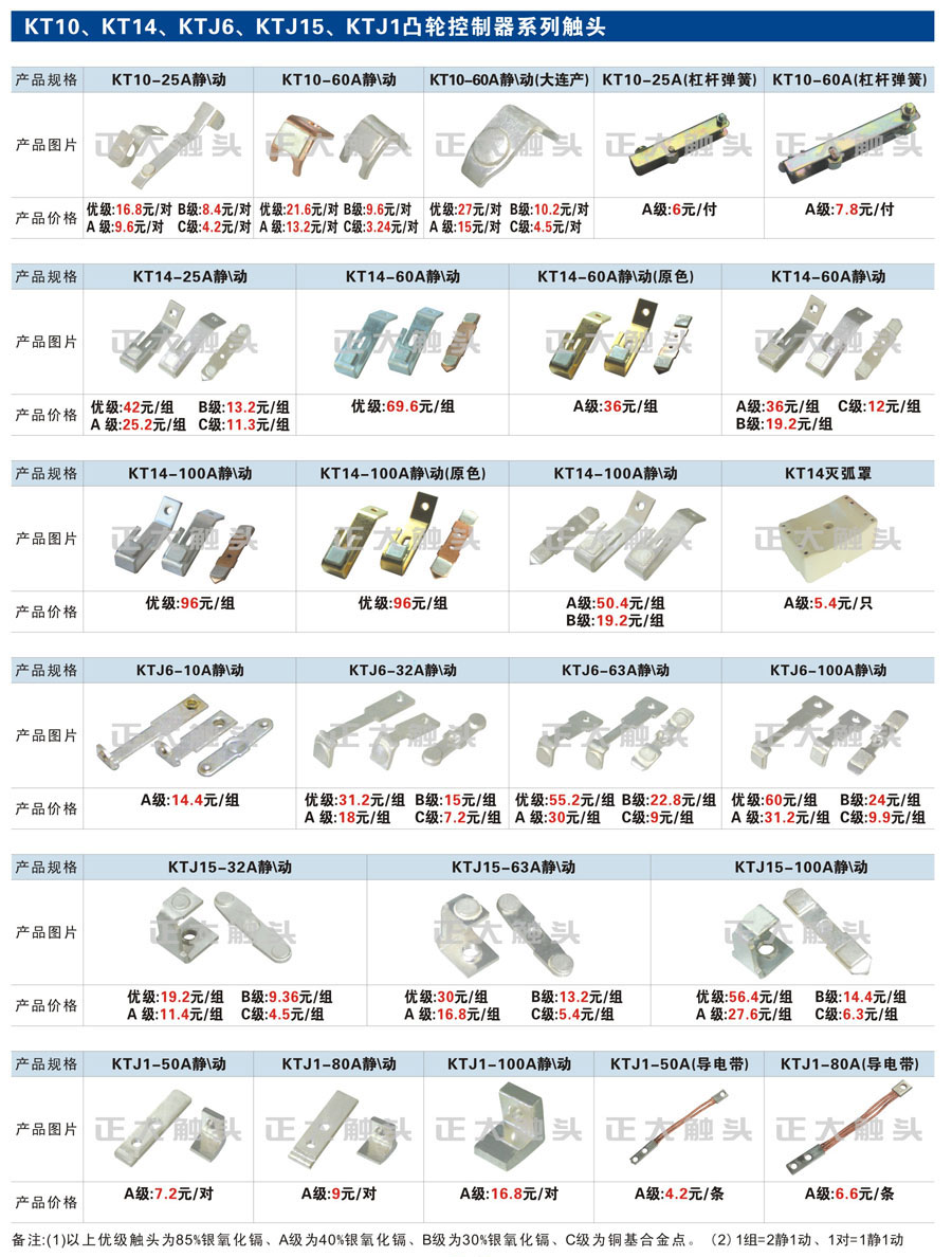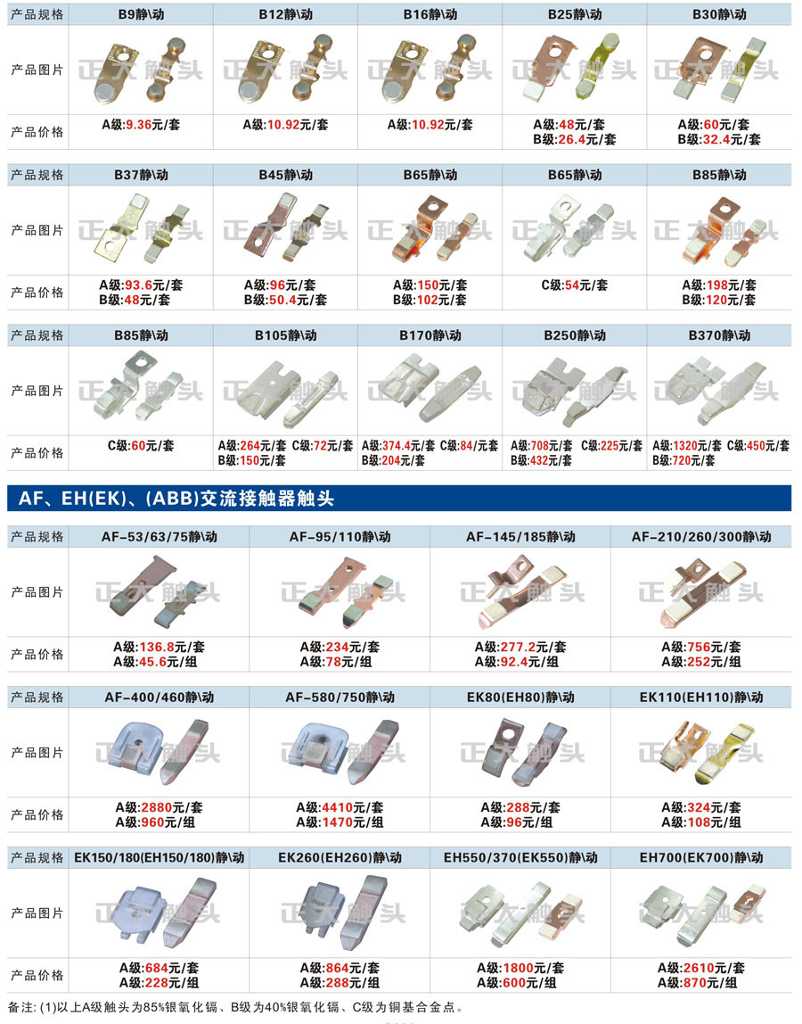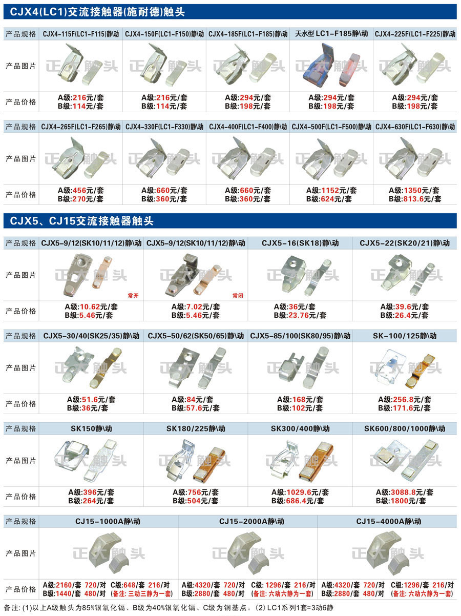 触头元件作为电器开关核心元件,主要用于接触器,继电器,断路器,凸轮控制器,补偿器,行程开关,脚踏开关,辅助开关等。正火电气现生产CJT1,CJX1,CJX2,CJX4,CJX5,CJX8(B系列)CJ20,CJ40,CJ12,CJ15,CJ24,CJ24Y,CJ0,CDC10,CJ91,CT91,CJ913,CJ914,CJ3,CJ8Z交流接触器触头,CZ0,CZ1,CZ3,CZ17,CZ18,CG5直流接触器触头,QJ3,QC83补偿器触头,凸轮控制器,主令触头,KT10,KT12,KT14,KTJ1,KTJ5,KTJ6,KTJ15(QT5),LK1,LK17,LK18,THQ1,TQKT等;断路器触头DW10,DW16,DW15,DW17,DW45,DZ10,DZ20,内燃机触头,矿用触头,叉车,吊车触头,JYN1,JYN2,ZN28,SN10,VS1,梅花触头等。进口ABB系列AF,EH,EK,富士SC系列,日立H系列,施耐德LC1系列,西门子3TF,3TB系列,LG公司(LS产电)GMC系列,三菱机电SN系列。与国内正泰,德力西,天正,人民等,国外ABB,施耐德,西门子,富士,三菱等厂家电气配套。
